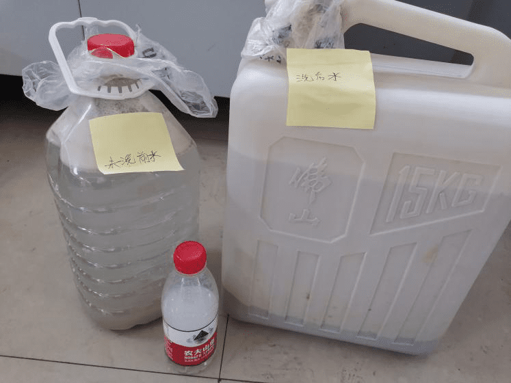 經過銷售和客戶的溝通之后,客戶寄來了三種水樣——未洗前水為地鐵抽上來的水泥沙經清洗過后的濾液。洗后水為濾液經過盾構機循環攪拌后的清洗液;小瓶水為玻璃劑溶液,用來潤滑盾構機用。